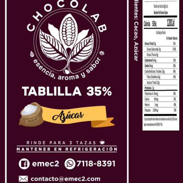 Chocolate artesanal con 35% de cacao. 100 gramos de sabor suave, natural y hecho en El Salvador.